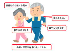 胸を軽く開いて、背すじを伸ばして歩きましょう。