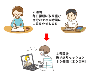 4週間の実践をオンライン個別セッションで振り返ります。振り返りを通して気づきを深め、新たな行動につなげます。